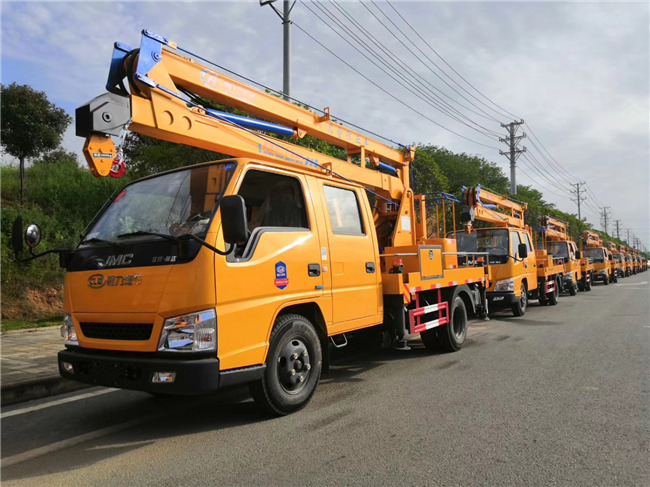 江鈴(新款)雙排工程黃駕駛室,軸距3360mm,江鈴115馬力國五發動機,油剎,五檔變速箱,7.00R16鋼絲胎,帶ABS.加裝空調。作業高度12米,液壓360度全回轉,2節折疊臂,單液壓舉升缸,帶雙向平衡閥,電控操作舉升臂,四支液壓油缸可調式支腿帶雙向液壓鎖(支腿操作為手動操作,可單獨控制)、最大作業幅度5.2米、最大起吊高度6.5米。
