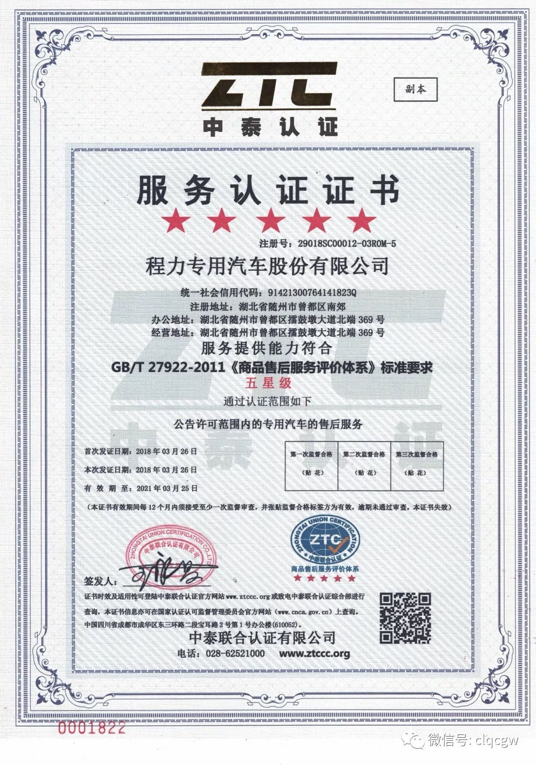 熱烈祝賀程力專用汽車股份有限公司榮獲售后服務(wù)五星級認(rèn)證