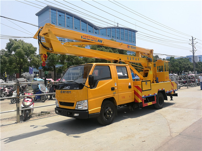 江鈴(新款)雙排,軸距3360mm江鈴115馬力國(guó)五發(fā)動(dòng)機(jī),油剎,五檔變速箱,7.00R16鋼絲胎,帶ABS.加裝空調(diào)。作業(yè)高度12米,液壓360度全回轉(zhuǎn),2節(jié)折疊臂,單液壓舉升缸,帶雙向平衡閥,電控操作舉升臂,四支液壓油缸可調(diào)式支腿帶雙向液壓鎖(支腿操作為手動(dòng)操作,可單獨(dú)控制)最大作業(yè)幅度5.2米、最大起吊高度6.5米。