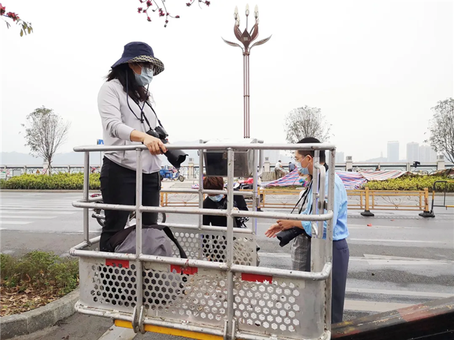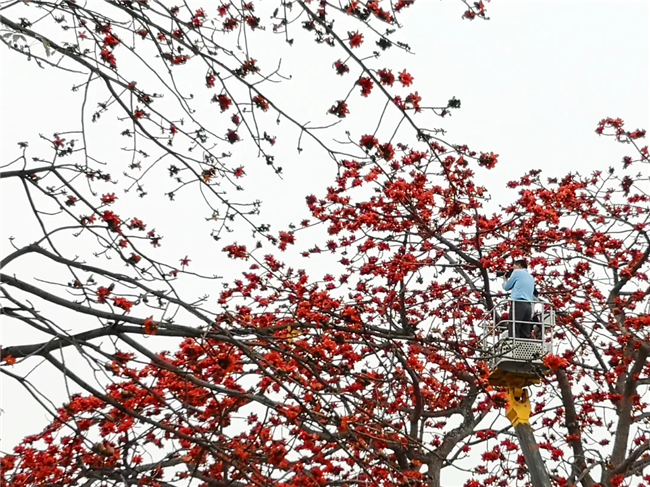 原來,是攝影愛好者為了拍下美美的木棉花,租下了高空作業車,與閱江樓門前怒放的紅棉來個“近距離接觸”。