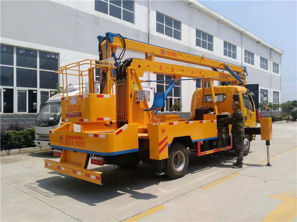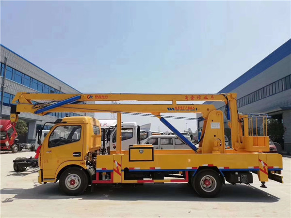 東風單排18米高空作業車采用折疊式曲臂結構,作業臂為三節折疊式,工作斗和轉臺雙工作位,上下操作,液壓手動控制,可360度回轉,四液壓支腿,帶1噸吊鉤,工作斗最大承重200公斤,鋼制工具箱及圍板、花紋防滑走臺板。