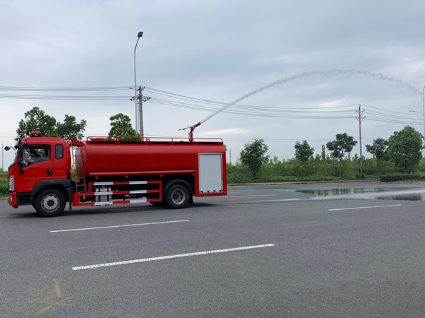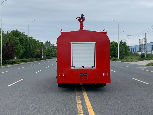 1)消防車功能:該車安裝了后置式消防泵,工作壓力在1.0 Mpa,在發生為災時啟動消防泵,關閉灑水功能閥門,操作消防炮,射程達55米以上,消防炮流量大,射程遠,即可滅火。